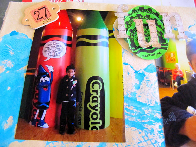 Last October we had gone to the Crayola Factory. Ashish and myself had so much fun there making crafts and coloring with the various crayola products. This page is about that trip and the background paper is my son's artistic work. I've also glued the ticket/stickers on the top of the page.